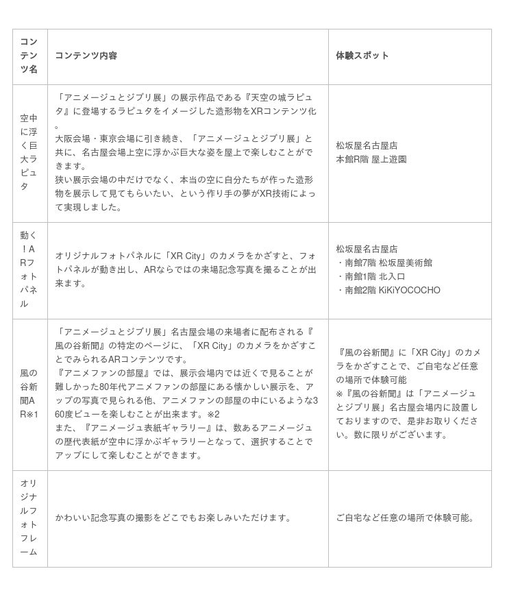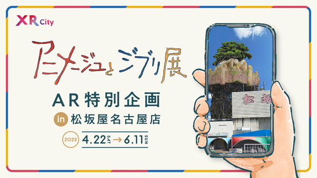 本イベントは、2023年4月22日(土)~2023年6月11日(日)まで松坂屋美術館(松坂屋名古屋店 南館7階)にて開催される「アニメージュとジブリ展」と、コノキューが提供する新感覚街遊びAR(拡張現実)サービス「XR City」のコラボイベントであり、大阪会場、東京会場に続き、開催いたします。お客さまがアプリ「XR City」をダウンロードしたスマートフォンを指定の場所や指定のモノにかざしていただくと、「アニメージュとジブリ展」とコラボレーションしたオリジナルARコンテンツをお楽しみいただけます。