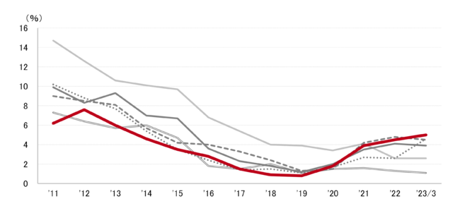 リーシング活動の活発度を表す指標である成約面積は、対前年同期比で2021年第2四半期以降プラスが続いていたが、直近2023年第1四半期は8期ぶりでマイナスに転じた。リーシング活動の拡大傾向には変化の兆しが出始めている。