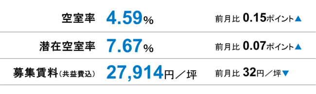 空室率は前月比プラス0.15ポイントの4.59%となった。複数の新築ビルが空室を抱えて竣工したことや、昨年竣工したビルへ移転したテナントの二次空室が現空となり、主な上昇要因となっている。潜在空室率も前月比プラス0.07ポイントとなり、空室率同様に2ヵ月連続で上昇した。今後も新築ビルの竣工が控えており、空室を抱えたビルの竣工で空室率の上昇が続くのか、動向が注目される。
