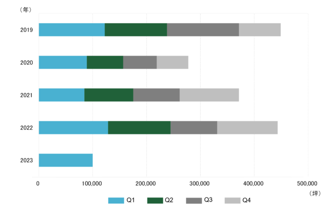昨年後半から、米国IT企業を中心に雇用調整が相次ぐ上、世界的な景気後退への懸念も広がっている。足元では外資系企業全般でオフィス移転計画が停滞する動きが見られ、成約面積の拡大傾向が変化する背景となっている。今年の大量供給は第2四半期にピークを迎えるが、竣工時にまとまった面積の空室が顕在化する可能性が高まりつつある。