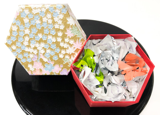 菓匠花見「白鷺宝」と抹茶味の「茶ちゃ」こし餡の「玉しずく」を特別な六角形の箱に詰め合わせました。