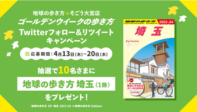 会期中、「そごう大宮店」と「地球の歩き方」の公式Twitterを2アカウントフォローし、そごう大宮店から配信される対象ツイートをリツイートしていただいた方の中から、抽選で10名さまに『書籍/地球の歩き方 埼玉「地球の歩き方 J07 埼玉 2023-24」(C)地球の歩き方/Gakken』をプレゼントいたします。