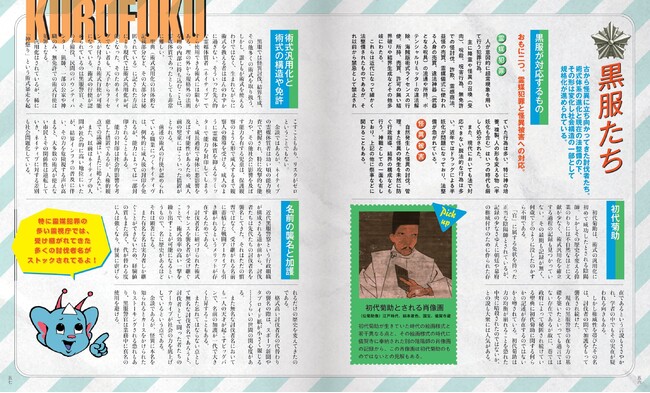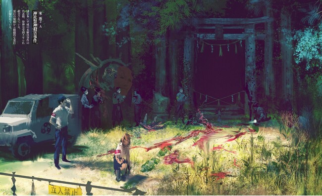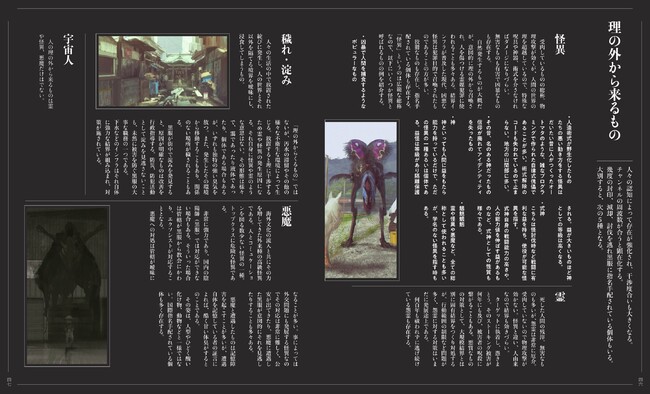 街のあちこちで討伐、調査、休憩など活動する黒服警官たちのほか、その封印や滅却から逃れる怪異の数々、そのどちらにも属さない民間陰陽師や社会的混乱を招く扇動者、僧兵を束ねるリーダーなど、今回はじめて明かされるその人物たちの詳細なプロフィールをはじめ、緻密な人物画も掲載する。