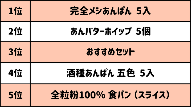 第1位は、昨年のランキング同様2022年8月に限定数を販売開始した日清食品とのコラボ商品「完全メシあんぱん 5入」となりました。続いて季節限定商品の「あんバターホイップ 5個」とサブスク限定商品の「おすすめセット」がランクイン。