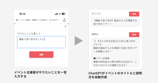 今回、ChatGPTを用いたイベント募集作成機能により、イベントを主催したいユーザーは、やりたいことを簡単な一言で入力するだけで、面倒なイベント募集のタイトルと本文を自動作成できます。