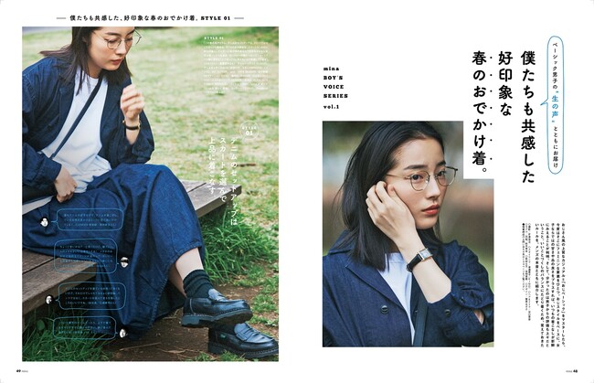 トレンチコート、ボタンダウンシャツ、カーディガン、デニム、革靴、メガネetc. おじさんアイテムの上質さを取り入れたカジュアル=「おじベーシック」。そんなminaのベーシックカジュアルにおいては、女性ファッション、男性ファッションの垣根はありません。だからこそ、雑誌も「ふたりで」シェアしてほしい。それが新装minaの「想い」です。