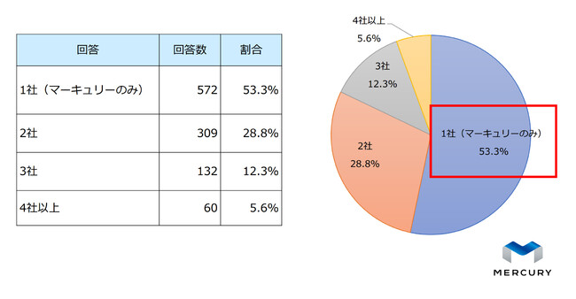 求職者が獲得する内定数の割合は株式会社マーキュリーでは1社(株式会社マーキュリーのみ)が53.3%と大半を占めたが、市場では3社以上が33%と一番多く、市場とは異なる結果となった。株式会社マーキュリーに新卒で入社した学生の傾向として、1社で内定を獲得した後、そのまま承諾から入社を決めた学生が半数以上を占めた。