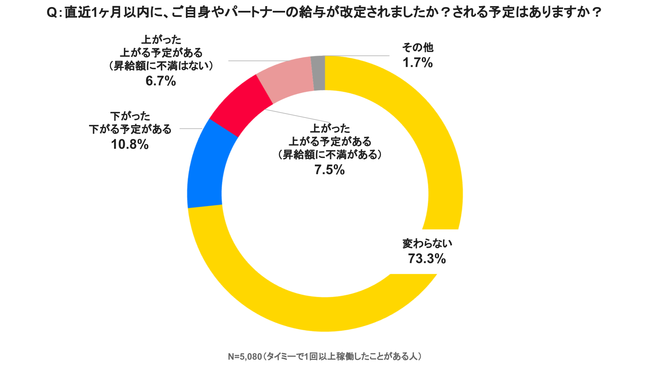支出が増え家計の負担は増える一方だが、“直近1ヶ月以内の給与改定”についての質問への回答では、「変わらない(73.3%)」、「下がった・下がる予定がある(10.8%)」となり、値上げ・物価高に伴う支出増を感じる方の多さと比較して、収入増となっていない方が多くいることが確認された。