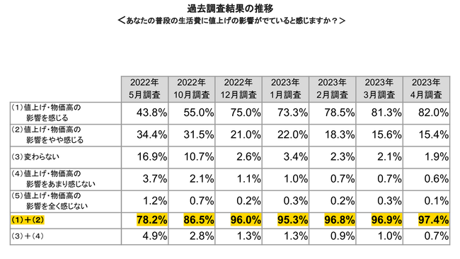 ■2021年12月と現在を比べて、普段の生活費に値上げの影響が出ていると感じている人は、97.4%という結果になった。過去の調査結果の推移からみても、高止まりしている状態がわかる。
