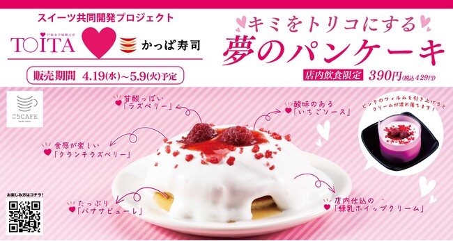 戸板女子短期大学(東京都港区)との産学連携企画として、食物栄養科の学生が考案したスイーツメニュー「キミをトリコにする夢のパンケーキ」を同日より全店にて販売いたします。