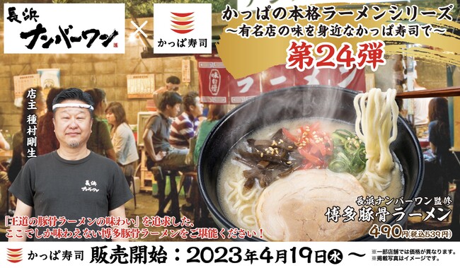コロワイドグループのかっぱ寿司(カッパ・クリエイト(株) 本社:神奈川県横浜市)は、2023年4月19日(水)より「本格ラーメンシリーズ」第24弾として、「長浜ナンバーワン」が監修する『博多豚骨ラーメン』をかっぱ寿司全店にて販売いたします。
