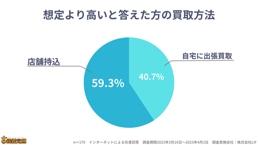 買取方法別で見てみると「想定より高かった」と答えた方の約59%は「店舗への持込買取」によるものでした。一方、「自宅に出張買取」は約41%と、直接店舗で買取してもらった方が高く売れる傾向があるようです。
