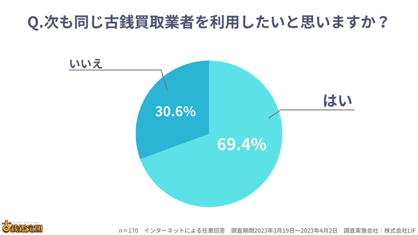 「次も同じ古銭買取業者を利用したいと思いますか?」と、古銭買取サービスを利用した男女170人にアンケートしたところ、下記のような結果となりました。