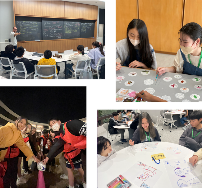 別の日には、ある画家の作品作りのプロセスについて描写されたケース教材を読み、そのプロセスに沿って自然を題材にした作品作りを体験しました。他にも、既存の思考を脱却して物事をより創造的に考える力を育てる「クリエイティブ・プロジェクト」では、脈絡のない絵を繋げて作成した物語を発表するなど、机に向かった学習のみならず五感を使って思考力を高め、討議を通して思考を深めて、プレゼンテーションや作品を通じて表現する国際高等学校ならではの学習方法を体験しました。