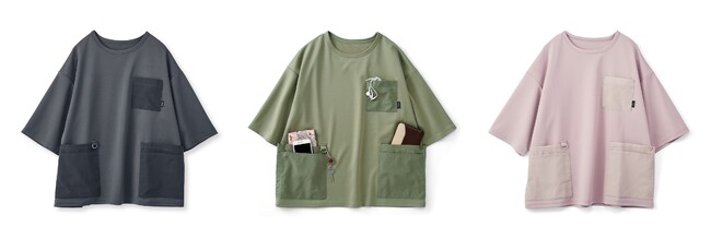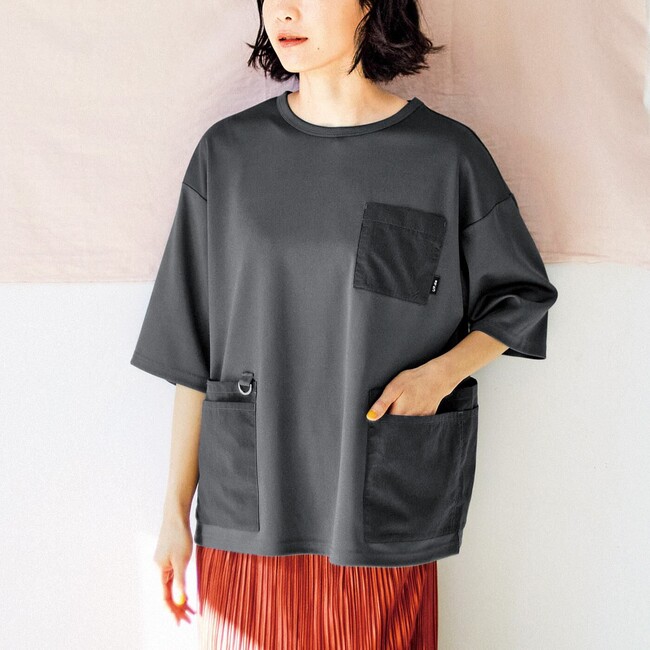 一枚でさらっと着こなせ、美しい印象を与えるボックスシルエットのTシャツです。さらに、両脇に2段のポケットがあり、バッグを持たずにお出かけする際に便利です。犬の散歩やウォーキングなど、荷物を少なくしたい場面で大活躍するアイテムです。