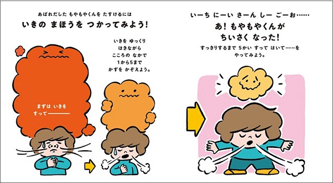本書では深呼吸を“いきのまほう”と表現。吸って、吐いてを繰り返すうちに、心のモヤモヤを鎮める効果があります。