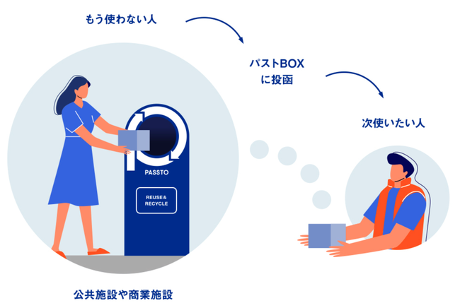 PASSTO開発の背景 当社は、15年以上不要品の再流通に取り組んで参りましたが、その中で最大の課題は、ものを「捨てる」ためのインフラに対して「循環させる」ためのインフラが圧倒的に不足しており、生活者の身近に存在していないということです。 この課題を解決するために、不要品の回収・選別・再流通を一気通貫で行うオリジナルブランド「PASSTO(パスト)」(https://passto.jp)を開発いたしました。PASSTOとは、PASS TOを短縮した造語で「次の人に渡す、未来につなぐ」ということを意味しています。「ググる」という言葉がGoogle検索を意味することになったように、「パストする」という行為が動詞となって、捨てずに渡すという行為の象徴となることを目指して、印象的でビビッドな青とシンプルで記号的なロゴマークを組合せて、プロダクトをデザインいたしました。