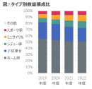 電動アシスト自転車で数量構成比51%を占めるホーム車*1は数量前年比1%増とほぼ前年並みであった(図2)。次いで販売が多い子供乗せ*2は数量前年比6%減と低調で、数量構成比では22%となった。出生数が減少していることもあり、子供乗せの減少トレンドは今後も続くと考えられる。