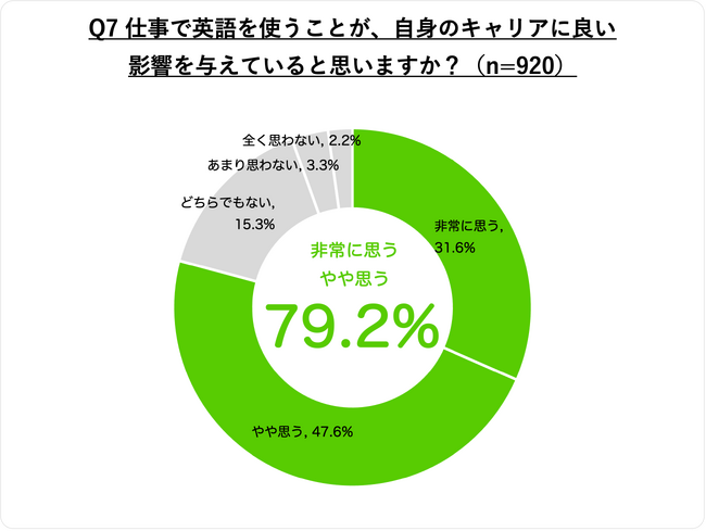 実際に82.9%の回答者が、英語がわからず困った経験があるようで、現在の英語力レベルが上級者(流暢)の回答者でさえも、半数以上が英語に困った経験があるようです。 このように慣れない言語での仕事は苦労することも多いですが、「仕事で英語を使うことが、自身のキャリアに良い影響を与えていると思いますか?」という質問に対しては、31.6%が「非常に思う」と回答。「やや思う」を合わせると、80%近くが良い影響を与えていると回答しました。 ビジネスの機会が広がり、キャリアアップやキャリアの選択に良い影響を与えているようです。