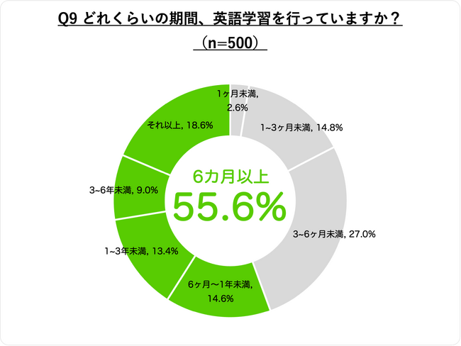 実際にビジネスで英語を使うビジネスパーソンは、仕事を円滑に進めるために、英語学習の必要性を他の人よりも 強く感じているようです。 学習を行っている人のうち、55.6%は半年以上の学習を継続しており、3ヶ月以上の学習者を入れると82.6%にものぼりました。週3日以上学習している人は60%、学習時間も比較的長く、3人に1人は1時間以上の英語学習を行っていると回答。 ビジネスで英語を使っているからといって自然と英語が身に付くわけではなく、英語学習を習慣化しているビジネスパーソンが多いようです。