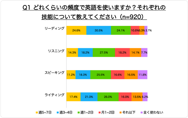 1. 最も使われる技能はリーディング。キャリアアップと共に他技能も必要に。 本調査では英語技能を「リーディング(英語で資料やメールを読む等)」「リスニング(英語での会議、接客等)」「スピーキング(英語での会議、プレゼン等)」「ライティング(英語で資料やメールを作成する等)」の4つに分類し、それぞれの使う頻度について質問をしました。 最も使われているのはリーディングであり、半数以上のビジネスパーソンが週3日以上使うと回答。週5日以上使うビジネスパーソンは約4人に1人となりました。しかし、リスニング、スピーキング、ライティングのその他3技能においても約60%が週1日以上の頻度で使っていると回答し、どの技能もバランスよく伸ばす必要があることが分かりました。