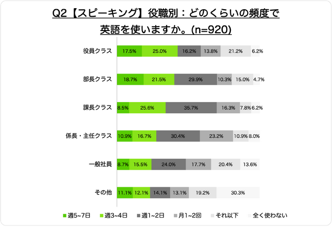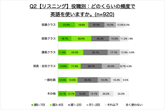 勤続年数に関する質問では、40%近くが20年以上の勤続経験があると回答しており、キャリアを積んでいくにつれて、英語を使うシーンが増えることが予想されます。 役職が高いほど、英語を使う頻度が高くなる傾向にあり、特にリスニング・スピーキングの2つの技能においては、一般社員のうち27.5%が週3日以上リスニングを、24.2%が週3日以上スピーキングを使うと回答したのに対し、役員クラス・部長クラスではそれぞれ40%を超え、より高いポジションにつくほどオーラルコミュニケーションの機会も増えることが分かりました。