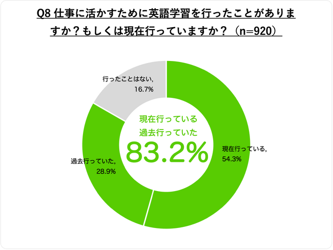 仕事で英語を使うビジネスパーソンは、英語学習にどのように向き合っているかについても調査を行いました。 1. 8割以上が3ヶ月以上の英語学習を行っていると回答。実際に英語を使うビジネスパーソンは英語学習の必要性を強く感じている様子。 「仕事に活かすために英語学習を行ったことがありますか?もしくは現在行っていますか?(義務教育での英語学習を除く)」という質問では、半数以上が現在進行形で英語学習を行っていることが明らかに。過去行っていた人も含めると83.2%となりました。 これは、Duolingoが国内在住の4700名を対象に行った調査(2021年12月実施)で、英語学習を行っている人は1 割以下という結果になったことをふまえると、非常に多い数字となります。 また、行ったことはないと回答した人のうち、半数以上は10年以上の海外居住経験がある回答者でした。