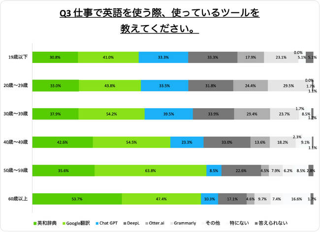 2. 半数以上がGoogle翻訳を利用。10代~30代ではChatGPTの活用も 仕事で英語を使う際、52.3%がGoogle翻訳を活用していると回答。英和辞典が最も人気だった60代以外、全ての 年代においてGoogle翻訳が一番人気となりました。 活用ツールでは年代間の違いも見られました。40代以上は英和辞典とGoogle翻訳が最も使われているツール1,2 位だったのに対し、10代~30代ではGoogle翻訳の次にChatGPTを利用する人が多い結果に。DeepLなどの高 精度な翻訳ツールや英和辞典を抑えての結果となり、直近のSNS等での盛り上がりも影響しているのか、 ChatGPTのようなAIアシスタントが身近な存在になってきているようです。