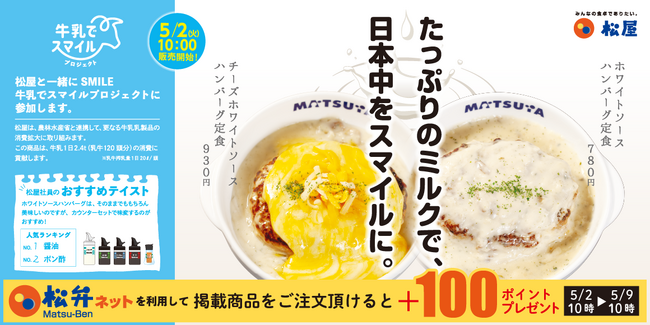 5月2日10時~5月9日10時まで、松弁ネットを利用して「ホワイトソースハンバーグ定食」「チーズホワイトソースハンバーグ定食」関連商品をご注文頂けると、100ポイントプレゼントいたします。