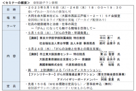 本セミナーは、2022年2月より当社が実施している東京大学医学部附属病院(東大病院、病院長:田中 栄)との共同研究(次ページ参照)の一環として開催するものです。また、今回は、同病院に加え、大阪府で「がん患者の就労支援」等に取り組む厚生労働省 大阪労働局 (局長:木原 亜紀生)および独立行政法人労働者健康安全機構 大阪産業保健総合支援センター(所長:高井 康之)との共催となります。