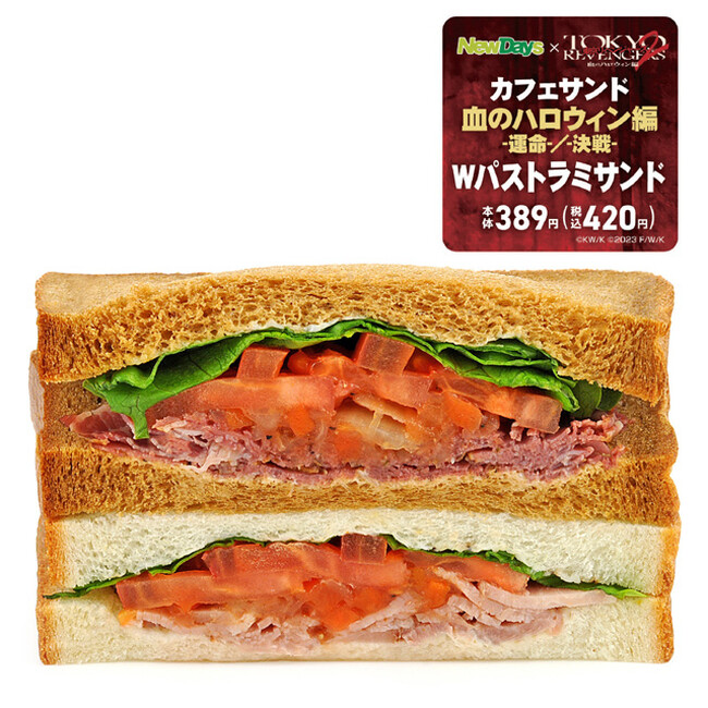 血のハロウィン編をイメージしたカフェサンドです。パストラミビーフとポーク、2種類のお肉を使用しそれぞれをトマトと合わせました。2層異なる味わいで、様々な想いが交錯する様を表現しました。