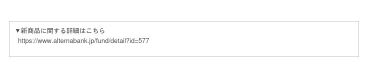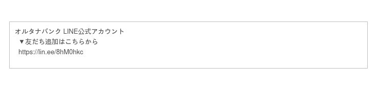 ■SAMURAI証券について 社名:SAMURAI証券株式会社 所在地:東京都港区赤坂二丁目17番46号 グローヴ4階 代表者:代表取締役社長 山口 慶一 登録番号:第一種・第二種金融商品取引業 関東財務局長(金商)第36号 加入協会・基金:日本証券業協会、一般社団法人第二種金融商品取引業協会、日本投資者保護基金 資本金:240,090,016円(2022年2月) 設立年月:2002年2月 URL:https://www.alternabank.jp/company/index ==================================================== ※お取引にあたって、諸費用等をご負担いただく場合がございます。 ※商品等には価格や為替等の変動により損失が生じるおそれがございます。 詳しくは契約締結前交付書面をお読みください。 ※投資の最終判断はお客様ご自身で行っていただきますようお願いいたします。 ==================================================== ▼ 個人情報保護について▼ 当社では、個人情報の取り扱いに関しまして当社策定の「個人情報保護に関する基本方針」に従っております。詳細は下記URLにてご確認ください。 https://www.alternabank.jp/legal/privacypolicy ▼『オルタナバンク』はこちらから▼ https://www.alternabank.jp/ ▼『オルタナバンク』SNSはこちらから▼ ・Facebook:https://www.facebook.com/pg/samurai.cf/ ・Twitter:https://twitter.com/Alterna_Bank ・Instagram:https://www.instagram.com/samurai_securities/ ・LINE:https://lin.ee/8hM0hkc ▼お問い合わせはこちらから▼ メール: support@alternabank.jp お問い合わせフォーム(お問合せ情報入力):https://www.alternabank.jp/help/inquiry/input ━━━━━━━━━━━━━━━━━━━━━━━━━━━━━━━━━━━━ 『オルタナバンク』は、SAMURAI証券株式会社が提供しております。 ━━━━━━━━━━━━━━━━━━━━━━━━━━━━━━━━━━━━