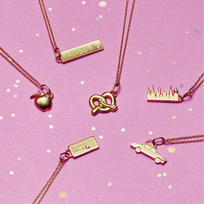 (左から時計回りに)ネックレス(すべて18KYG・ダイヤモンド)ビッグアップル¥220,000・マディソンアベニューサイン¥308,000・プレッツェル¥308,000・スカイライン¥253,000・イエローキャブ¥275,000・ブロードウェイチケット¥275,000(すべて税込)