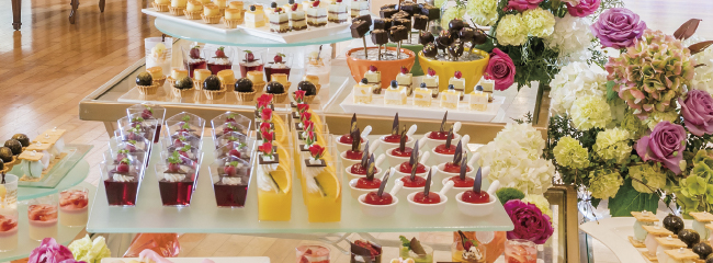 【Menu例】ベリーのパンナコッタ/イチゴのダンジュ/イチゴのロールケーキ/イチゴのムース/イチゴのケーキ/NYチーズケーキ/シャルロットケーキ/シフォンケーキ/アイスクリーム各種/わらび餅/白玉ゼンザイ/ブドウゼリー/桃のゼリー/グレープフルーツゼリー/季節のフルーツ盛合せ/サンドウィッチ各種/カナッペ各種/本日のキッシュ/ピクルス/グラスオードブル/お飲物各種 etc
