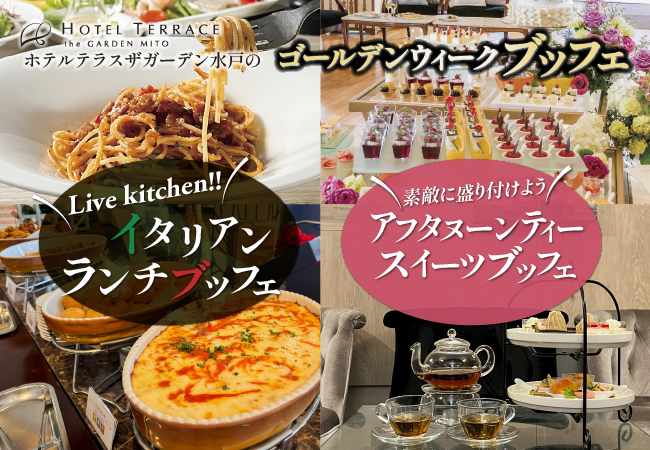 デザインと機能性を極めた都市型ホテル『ホテルテラスザガーデン水戸』(住所:茨城県水戸市/総支配人:奥村伸二/客室数:164)は、ゴールデンウィークの期間に“イタリアンランチブッフェ”と“アフタヌーンティースイーツブッフェ”の2種類のブッフェを販売いたします。