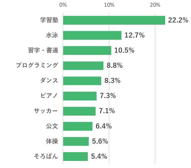 今回のアンケートでは85.3%の方が「習い事をしている」と回答。昨年調査と比較すると7.6pt減となりましたが、それでも8割以上と多くの割合の子どもが何らかの習い事に通っているということが見てとれます。