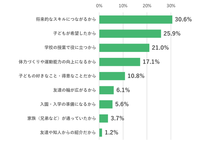 これから始めようか検討している習い事として、最も人気だったのは「学習塾」でした。理由としては「将来的なスキルに繋がるから」「子どもが希望したから」「学校の授業で約に立つから」の順で票が多く、お子さまの将来や未来を見越して学習塾に通わせたいと考えている親が多いようです。
