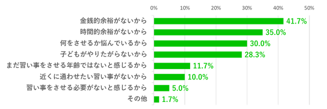 また習い事に通わせていないと答えた方に理由を訊いたところ、金銭的理由が41.7%と最も多い結果となりました。家庭の事情で子どもに習い事をさせられないといった課題があるようです。逆に「習い事をさせる必要がない」と答えた方は全体の5.0%で、子どもの教育のためになんらかの習い事をさせるべきだと考えている保護者が多いことが伺えました。