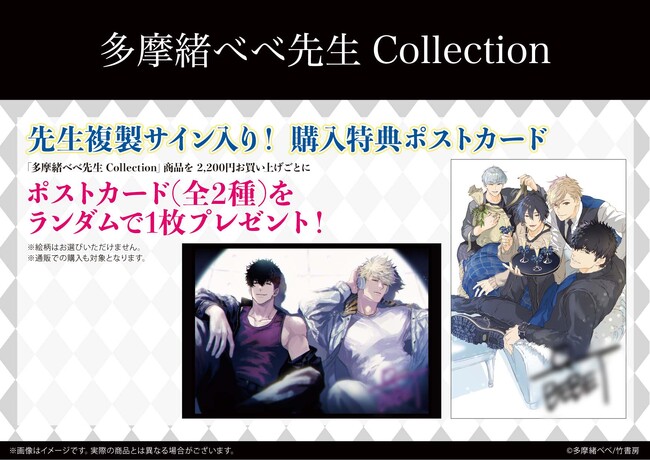 「多摩緒べべ先生 Collection」商品を1会計2,200円(税込)お買い上げごとに、購入特典ポストカード(全2種)をプレゼントしています。今回はなんと、べべ先生の複製サイン入りです! ワイルドなお顔と肉体でファンを虜にする東くん&大我くん、そして『ラブクオリア』の4人が揃った華やかなパーティーイラスト。どちらもGETして、購入したアイテムとともにニマニマ眺めてください♪ WEB開封式