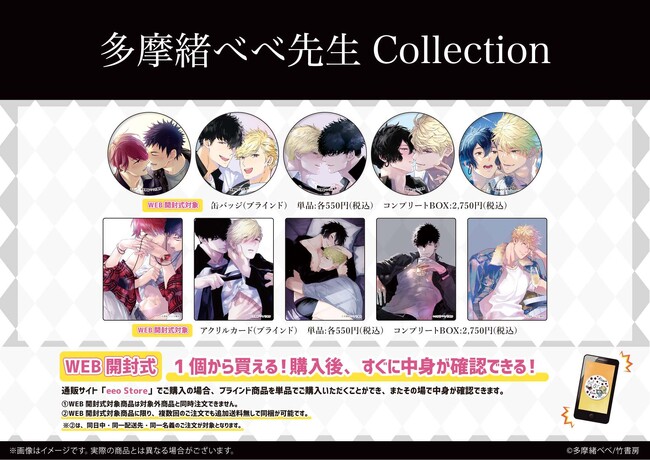 eeo Store(通販)のWEB開封式でご購入の場合、その場でブラインド商品の中身が確認できます。さらに、同日中・同一配送先・同一名義なら追加送料なしで同梱できるためお得です。 運試しのワクワクを満喫しながら、推し活をお楽しみください! ▼eeo Store(通販)へ▼ ご注文はこちらから! https://eeo.today/store/101/title/2873?utm_source=prtimes&utm_medium=press&utm_campaign=prt397 色男たちの不器用な恋愛模様を丁寧に描いた、べべ先生の作品たち。今回のグッズでも、表情や目線、指先などから漂う“圧倒的な色気”に魅了されたのではないでしょうか? 2022年12月からはスピンオフのジュン編『ラブイグナイト』の新連載も始まっています。ますます活躍の幅を広げる多摩緒べべ先生を、これからも応援していきましょう! ◆公式情報◆ ▽多摩緒べべ先生の公式Twitter https://twitter.com/BEBE_tamao ▽『親友と彼氏の定義』あらすじ https://bl.takeshobo.co.jp/info_qpa/3081/ ▽『ラブクオリア』あらすじ https://bl.takeshobo.co.jp/info_qpa/7466/ ▽『ラブインダルジュ』あらすじ https://bl.takeshobo.co.jp/info_qpa/12828/ (C)多摩緒べべ/竹書房 【会社概要】 社名 株式会社A3(エースリー) 設立 2012年9月27日 所在地 東京都豊島区南池袋 1-11-22 山種池袋ビル2F 代表者 代表取締役 小澤隆史 HP https://athree3.com/ 事業内容 ・Joy Creation Platform eeo事業 ・toBアライアンス事業 ・Momentum Base事業 【Joy Creation Platform eeo事業について】 楽しむわたしを、好きになる eeoは一人一人の価値観に合った「楽しむ機会」を提供し、 豊かなライフスタイルの実現を目的にしたプラットフォームです。 私たちは情報が多様化した世の中だからこそ、 「ほかの誰かが良いと思うものではなく、自分が良いと感じたものを大切にしたい」 と考えています。 eeoを通して、自分らしさを見つけたり、増やしていくことにより、 人生を楽しみ豊かにするお手伝いができたら。 そんな願いを込めて、eeoは楽しむ機会を提供し続けます。