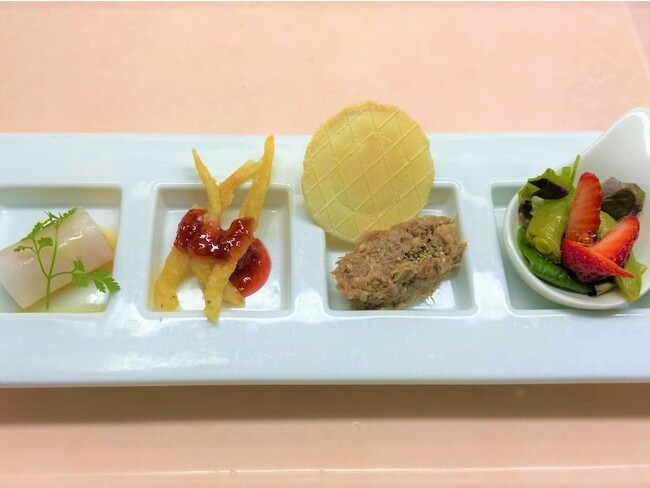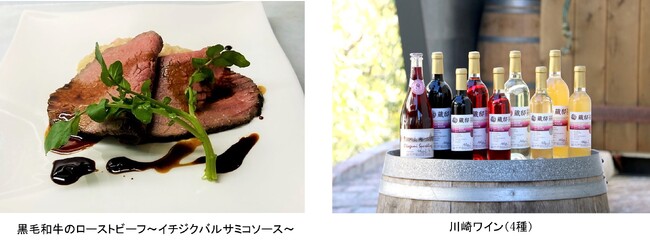 3. 食事は、川崎市北部の岡上地区でAIを活用し育成・栽培した苺や無農薬手植え玄米など、川崎産の旬の食材を使用した4種のワインにも合う特別なフレンチのフルコースを提供します。