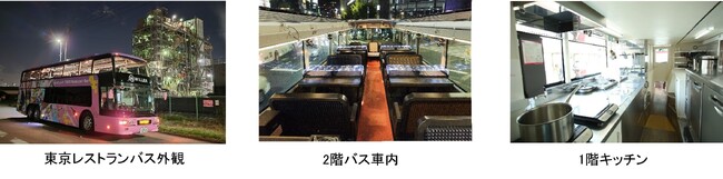 移動と食の融合により新たな感動体験を提供する「レストランバス」は、1階にキッチン、2階には対面式の座席とテーブルを備え、透明で開閉可能なオープンルーフは開放感があり、いつもと違う目線から眺める景色と、本格的な料理をお楽しみいただけます。東京レストランバスの外装は、東京らしさをイメージし、多数のビル群や観光名所を“食”と掛け合わせてポップなカラーリングでデザインしています。内装は、シックな色合いでまとめ、夜は調光可能なLEDと間接照明により、高級感あふれる落ち着いた空間になっています。