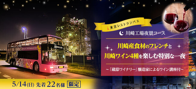 WILLER EXPRESS 株式会社(本社:東京都江東区、代表取締役:平山幸司、以下「ウィラーエクスプレス」)は、東京レストランバス川崎工場夜景コースの新プラン『川崎産食材のフレンチと川崎ワイン4種を楽しむ特別な一夜~「蔵邸ワイナリー」醸造家によるワイン講座付~』(※1)を、5月14日(日)に1日間限定で運行します。それに先駆け、明日4月25日(火)11:00頃予約サイト「WILLER TRAVEL」(https://travel.willer.co.jp/restaurantbus/tokyo/)にて、先着22名様限定で予約受付を開始します。