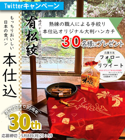 2023年4月24日(月)~5月8日(月)の期間、フジパン公式Twitterにおいて“日本の食パン”をキーワードに、日本の伝統工芸品“日本の絞り染め”『有松絞』とのコラボレーションした本仕込30周年キャンペーンを実施します。フジパン公式Twitterのフォロー&リツイートで抽選で30名様に「有松絞 本仕込オリジナルハンカチ」をプレゼント。本仕込の写真と「#おかげさまで本仕込30周年」のタグを使用して投稿したら当選確率UPのチャンス。