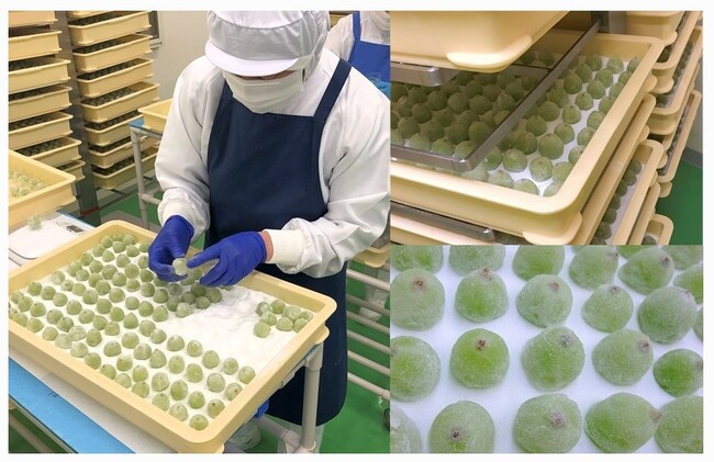 マスカットの粒の大きさはひとつひとつ微妙に異なります。 それを薄くきれいに求肥で包むのは機械生産では難しく、手作業の工程が欠かせません。 新鮮な生のマスカットをひと粒ずつ手包みする製法は、昭和54年の発売当初から40年以上変わらず、今に引き継がれています。 ▼特選ひとつぶのマスカット・シャインマスカットとは