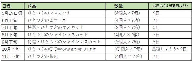 オンラインショップ限定でご予約のお客様に7か月間‟ひとつぶのブドウ”シリーズを毎月7箱ずつお届けします。 スタンダードな“ひとつぶのマスカット”をはじめ、数量限定の‟特選ひとつぶのマスカット”さらにご注文を頂いた方だけに作る‟特別なひとつぶ”もご用意。 ▼価格 G7 (Grape of Seven) ¥70,000(税込¥75,600) ※冷蔵便にてお届け・送料無料 ▼お届けスケジュール