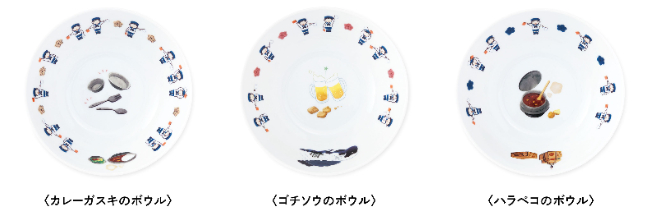 船員さんによる手旗信号と、船での生活にまつわるモチーフがかわいくデザインされた、〈カレーガスキのボウル〉〈ゴチソウのボウル〉〈ハラペコのボウル〉の3種類です。