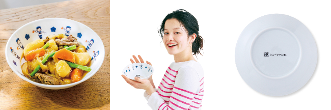 深さがあるボウルなので、肉じゃがなど汁気のある料理の盛り付けにも大活躍。一般的な磁器製品よりも約30%軽いのが特徴のお皿です。裏面にはミュージアム部のロゴが入っています。