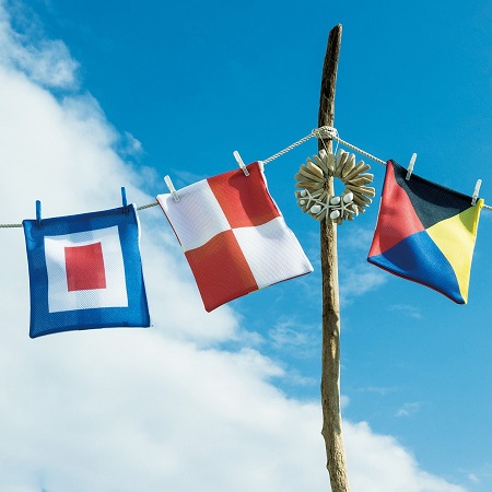 船舶間の通信に使われる世界共通の旗「国際信号旗」の文字旗が両面にデザインされた洗濯ポーチです。干せば物干しスペースに船上の光景が広がります。