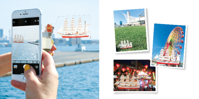 風景の中に帆船日本丸をプリントしたアクリルプレートをを差し入れて撮影すれば、思い出と一緒に自分だけの航海シーンが完成します。